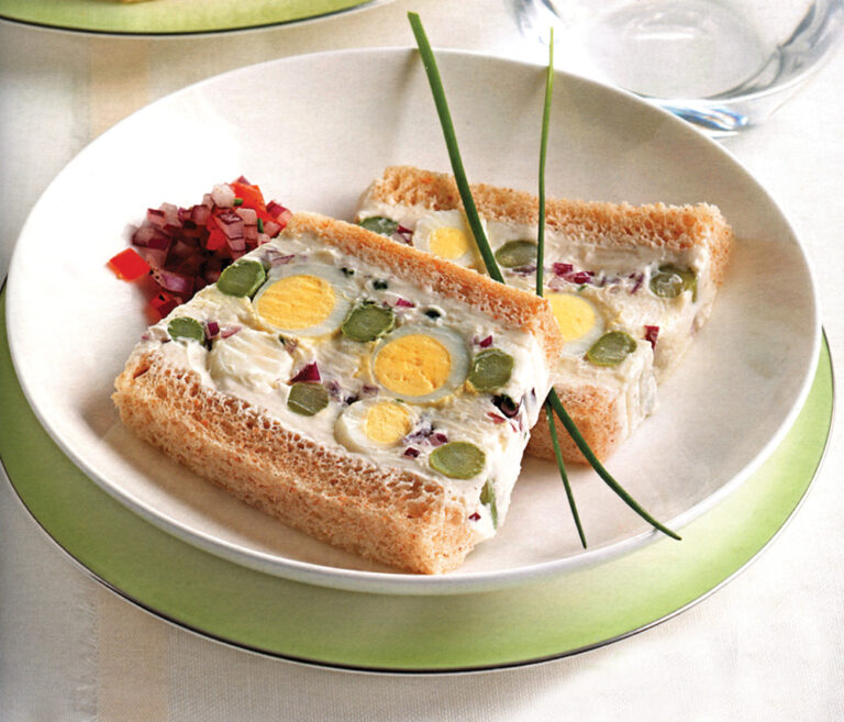 PRIPREMA: Šparoge očistiti i obariti. Umutiti sir i pavlaku, posoliti i pobiberiti. Kalup prekriti papirom za pečenje i obložiti kriškama hljeba lagano namočenim u mlijeko. Hljeb premazati jednim slojem sira i pavlake, rasporediti jaja, šparoge, isjeckan luk i začinsko bilje, te ponoviti postupak. Završiti kriškama hljeba, zamotati u prozirnu foliju i ostaviti najmanje tri sata u frižider prije rezanja na šnite.