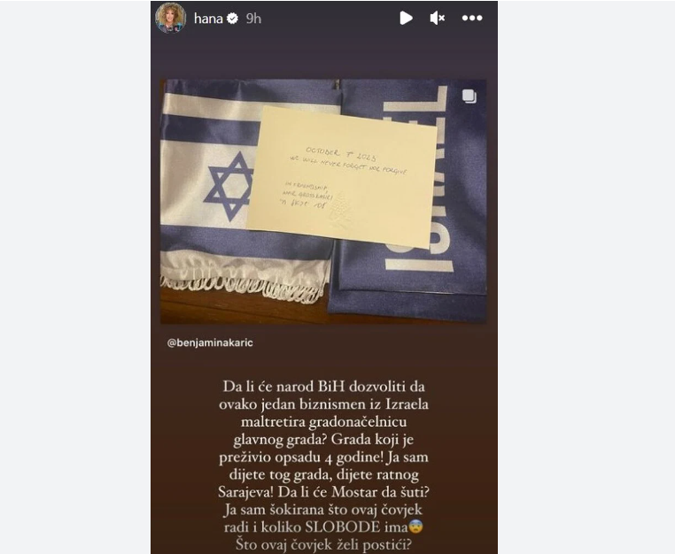 Influenserica je podijelila fotografiju paketa koji je Kabiri poslao Karić. U paketu je bio šal sa zastavom Izraela i poruka: "7. 10. 2023. Nikada nećemo zaboraviti ni oprostiti."