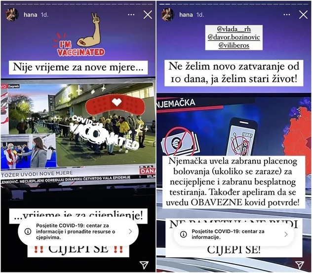 "Nije vrijeme za nove mjere.. Vrijeme je za cijepljenje! NE PAMETUJTE, želim stari život", napisala je Hana i dodala da apelira da se uvedu obavezne covid-potvrde.