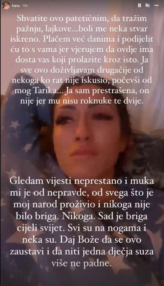 "Shvatite ovo patetičnim, da tražim pažnju i lajkove. Boli me neka stvar iskreno. Plačem već danima i vjerujem da ovdje ima dosta vas koji prolazite kroz isto. Ja sve ovo doživljavam drugačije od nekoga ko rat nije iskusio, počevši od mog Tarika. Ja sam prestrašena, on nije", navela je.