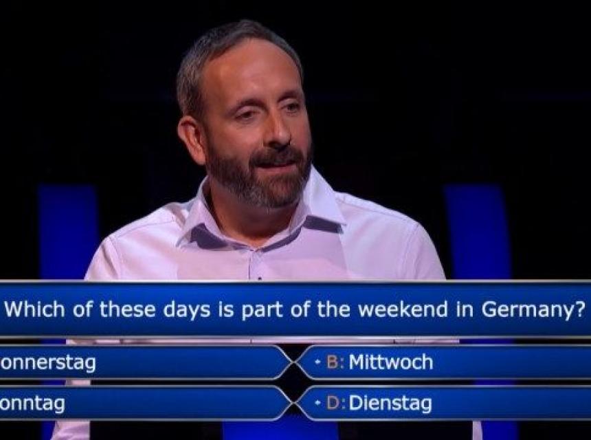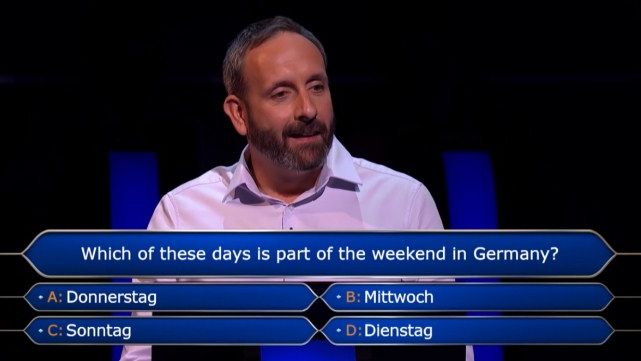 Igrač JP Morgan ostao je šokiran kad je iskoristio pogodnost „zovi“, a s druge strane slušalice nije bila njegova supruga koju je htio pozvati. Učitelj iz Linkolna nije znao odgovor na pitanje vrijedno 16.000 funti: Koji je od ovih dana dio vikenda u Njemačkoj, a ponuđeni odgovori glasili su A) Donnerstag, B) Mittwoch, C) Sonntag ili D) Dienstag, piše Jutarnji.hr.