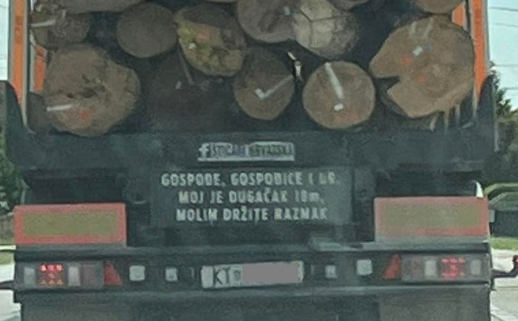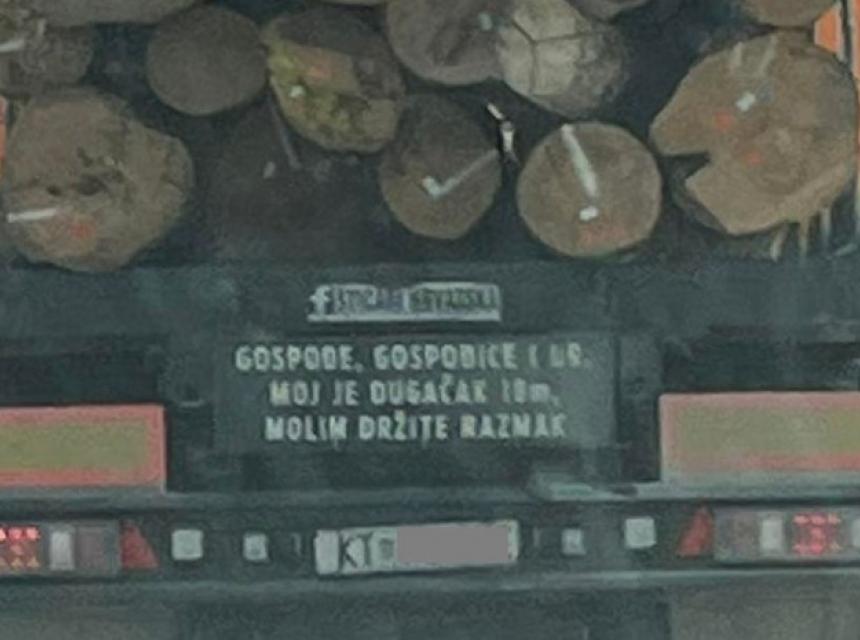 Vozač je na ovaj duhoviti način pokušao vozače upozoriti da drže primjerenu razdaljinu od kamiona kako bi se izbjegla opasnost sa obzirom na to da se na kamionu prevoze drva.