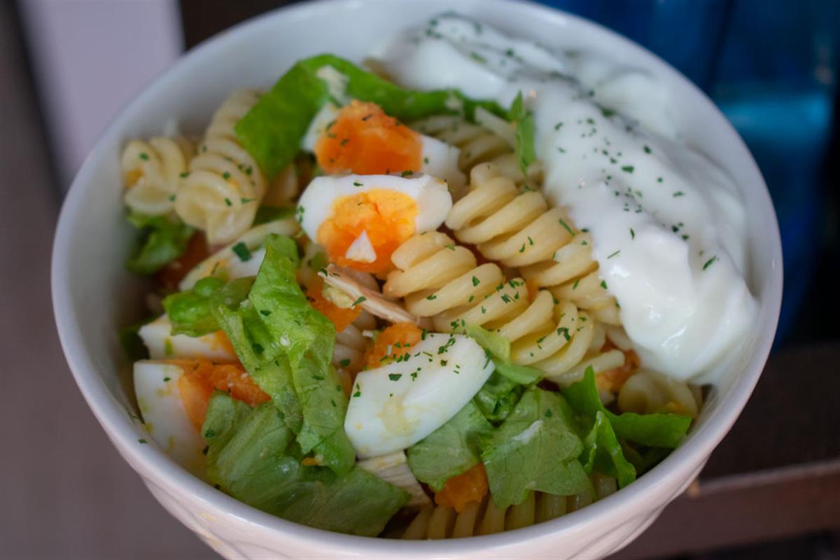 Avokado,cherry rajčice narežite na kockice i stavite u posudu. Dodajte salatu narezanu na manje trakice. Kada se piletina i tjestenina ohlade ubacite u salatu. Tvrdo kuhana jaja narežite na manje komadiće i ubacite u salatu.