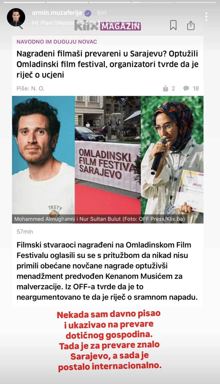 Naime, Muzaferija je na svom Instagram profilu uz screenshot teksta o rediteljima koji tvrde da im OFF duguje obećani novac podijelio sljedeću poruku: "Nekada sam davno pisao i ukazivao na prevare dotičnog gospodina. Tada je za prevare znalo Sarajevo, a sada je postalo internacionalno".