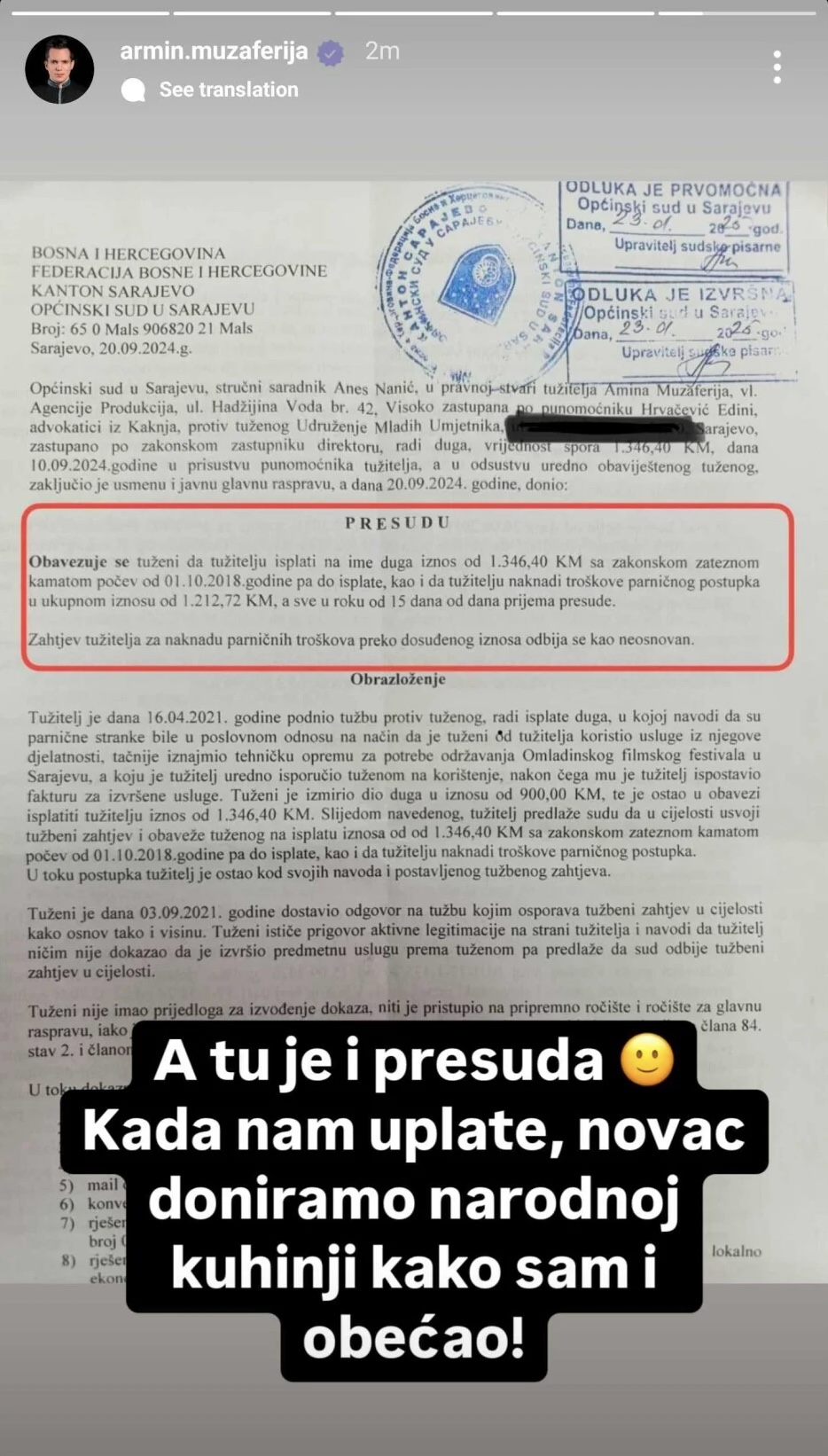 Muzaferija je tvrdio da je platio 1/3 fakture, a ostatak nikad nije pristigao. Sudeći prema fotografiji presude donesene 24.09.2024. godine, Udruženje mladih umjetnika na čijem je čelu Musić je Muzaferiji treba isplatiti dug od 1.346,40 KM uz zatezne kamate.