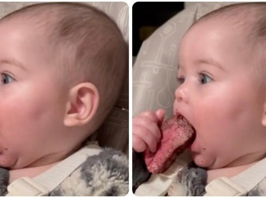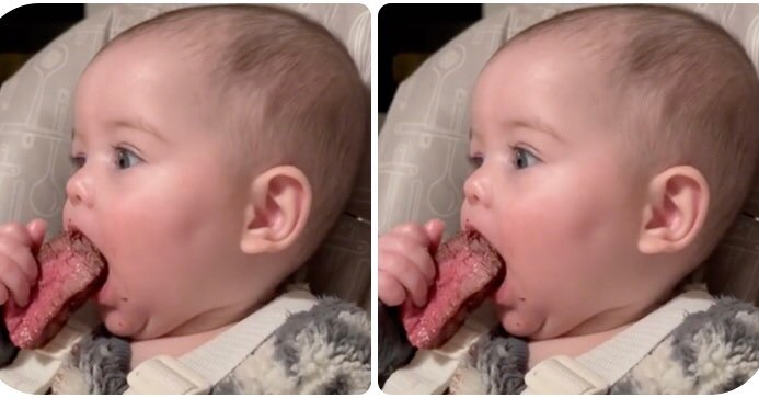 Katie je snimku objavila na TikToku. U njoj beba drži u ruci komad mesa i oduševljeno ga žvače. Iako je njoj prizor bio sladak, kritičari su je brzo uvjerili da se zapita je li pogriješila.
