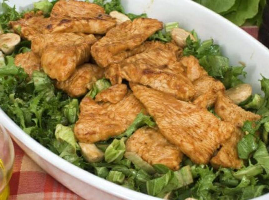 Za ovo jelo će vam trebati rukola, miješana zelena salata, balzamičo sirće, sok od limuna, so i biber, senf, javorov sirup, maslinovo ulje, pureći odresci, ulje.
