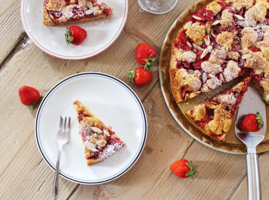 Kada se donji dio tijesta ohladi, rasporedite po njemu filu od jagoda. Zatim iz zamrzivača uzmite drugi dio tijesta te ga naribajte po fili od jagoda. Vratite protvan u pećnicu zagrijanu na 180 Celzijevih stepeni i pecite između 20 i 30 minuta tj. sve dok tijesto na površini ne dobije tamniju zlatnožutu boju.