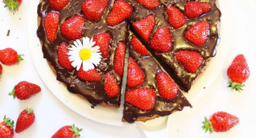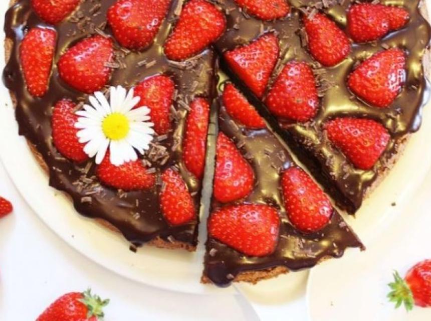 Čokoladu otopite na pari i ostavite sa strane da se malo ohladi. Bjelanjke izmiksajte u čvrsti snijeg. Žumanjke pjenasto izmiksajte sa šećerom pa dodajte ulje i otopljenu čokoladu. Naizmjenično dodajte palentu i snijeg od bjelanjaka. Lagano miješajte smjesu dok se svi sastojci ne sjedine. Pripremljenu smjesu izlijte u kalup za torte (26 cm) kojeg ste prethodno prekrili masnim papirom. Pecite 15-20 minuta na temperaturi od 180 °C. Vrhnje za šlag zagrijte do vrenja, dodajte razlomljenu čokoladu pa miješajte dok se ne otopi. Čokoladnu kremu ostavite na sobnoj temperaturi da se ohladi. Tako će se malo zgusnuti pa neće previše curiti preko ruba biskvita. Ohlađeni biskvit premažite čokoladnom kremom, a preko kreme posložite oprane i na veće komade narezane jagode. Poslužite uz šlag.