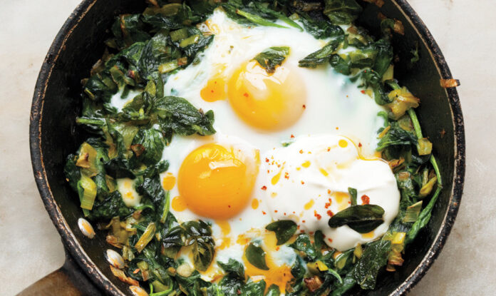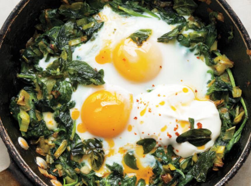POTREBNO: 2/3 šolje grčkog jogurta, 1 česno bijelog luka, so, po 2 kašike putera i maslinovog ulja, 3 kašike isjeckanog bijelog dijela prase, 2 kašike isjeckanog mladog luka, 10 šolja svježeg špinata, 1 kašičica soka limuna, 4 jajeta, biber, malo čilija u prahu i kašičica sušenog origana