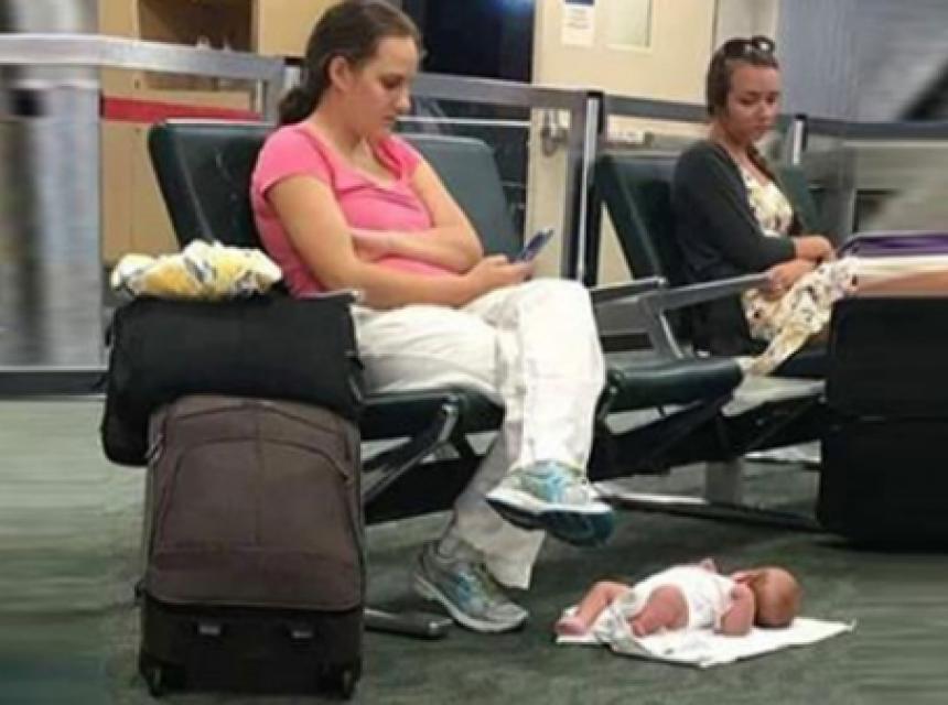 Lensing je snimljena na aerodromu u Coloradu dok je čekala svoj let kako sjedi i tipka na mobitelu, a dvomjesečnu bebu smjestila je na pod pored svojih nogu.