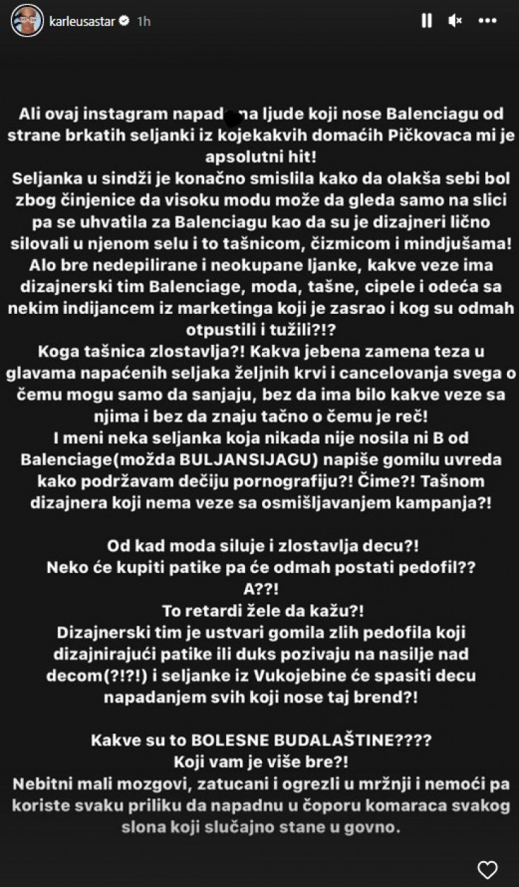 - Ali ovaj Instagram napad na ljude koji nose "Balenciagu" od strane brkatih seljanki iz kojekakvih domaćih pi*kovaca mi je apsolutni hit! Seljanka u sindži je konačno smislila kako da olakša sebi bol zbog činjenice da visoku modu može da gleda samo na slici, pa se uhvatila za "Balenciagu" kao da su je dizajneri lično silovali u njenom selu i to tašnicom, čizmicom i minđušama! Alo bre nedepilirane i neokupane ljanke, kakve veze ima dizajnerski tim "Balenciage", moda, tašne, cipele i odjeća sa nekim indijancem iz marketinga, koji je zas*ao i kog' su odmah otpustili i tužili - napisala je Karleuša između ostalog.