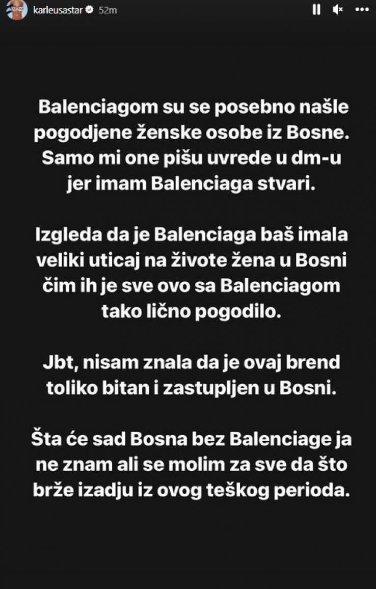 Jbt, nisam znala da je ovaj bred toliko bitan i zastupljen u Bosni. Šta će sad Bosna bez "Balenciage" ja ne znam, ali se molim za sve da što brže izađu iz ovog teškog perioda - napisala je Karleuša.