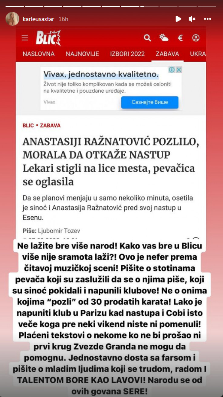 Ne lažite više narod. Kako vas u "Blicu" više nije sramota laži?! Ovo je nefer prema čitavoj muzičkoj sceni. Pišite o stotinama pjevača koji su zaslužili da se o njima piše, koji su sinoć pokidali i napunili klubove! Ne onima kojima "pozli" od 30 prodatih karata! Lako je napuniti klub u Parizu kad nastupa i Cobi isto večer kojeg niste ni spomenuli! Plaćeni tekstovi o nekome ko ne bi prošao ni prvi krug "Zvezda Granda" ne mogu da pomognu. Jednostavno dosta sa farsom i pišite o mladim ljudima koji se trudom, radom i talentom bore kao lavovi. Narodu se od ovih g**** s***! - napisala je Karleuša na svom Instagram storyju