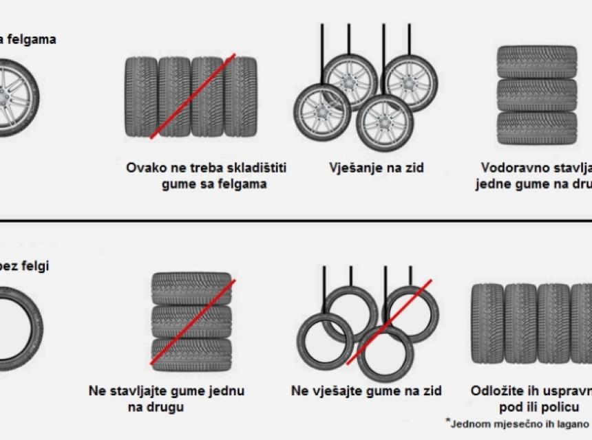 Gume skladištite u tamnoj prostoriji u kojoj je temperatura od +15°C do +25 °C i u kojoj vlažnost zraka ne smije biti tako visoka da na gumama dolazi do kondenzacije. Gume zaštitite od svjetlosti, posebno od drektne sunčeve svjelosti i intenzivne umjetne svjetlosti s visokim sadržajem UV zračenja. Nemojte ih skladišiti na mjestima gdje ima ulja, maziva ili hemikalija, savjetuje BIHAMK.