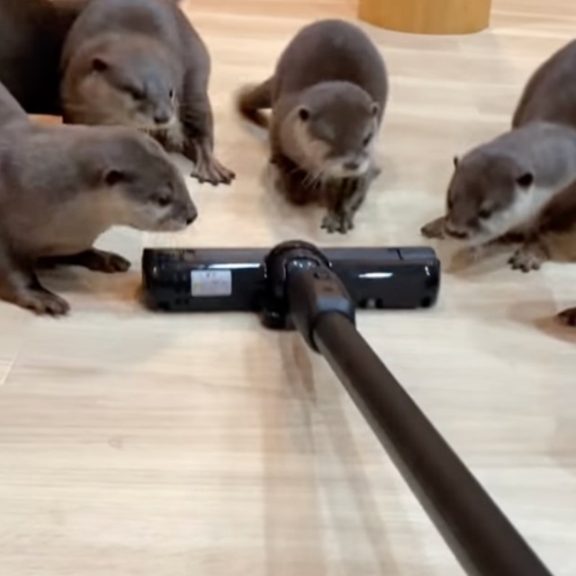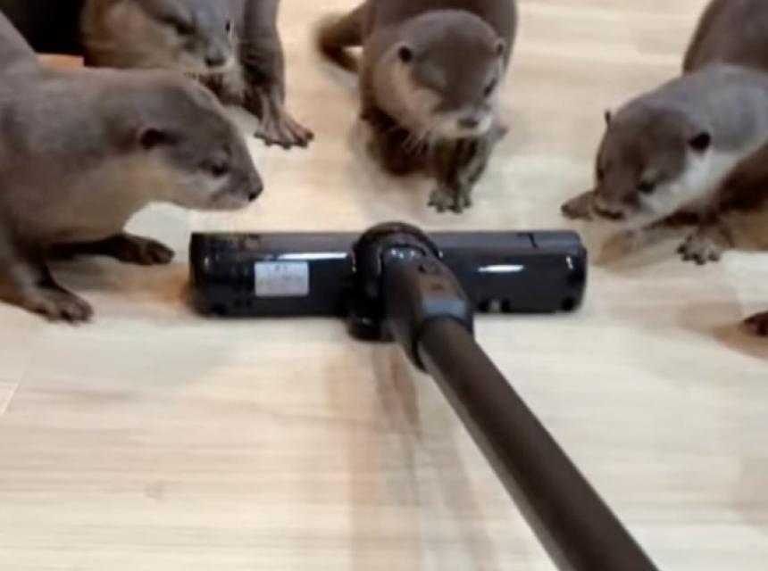 Hrpa vidri okupila se u dnevnoj sobi kako bi provjerila što radi taj kućanski aparat koji zadire u njihov prostor. Istovremeno ih je fascinirao pa su se sa zanimanjem kretale prema njemu, ali kad je cijev usisivača krenula prema njima, brzo su se povlačile u strahu od buke.