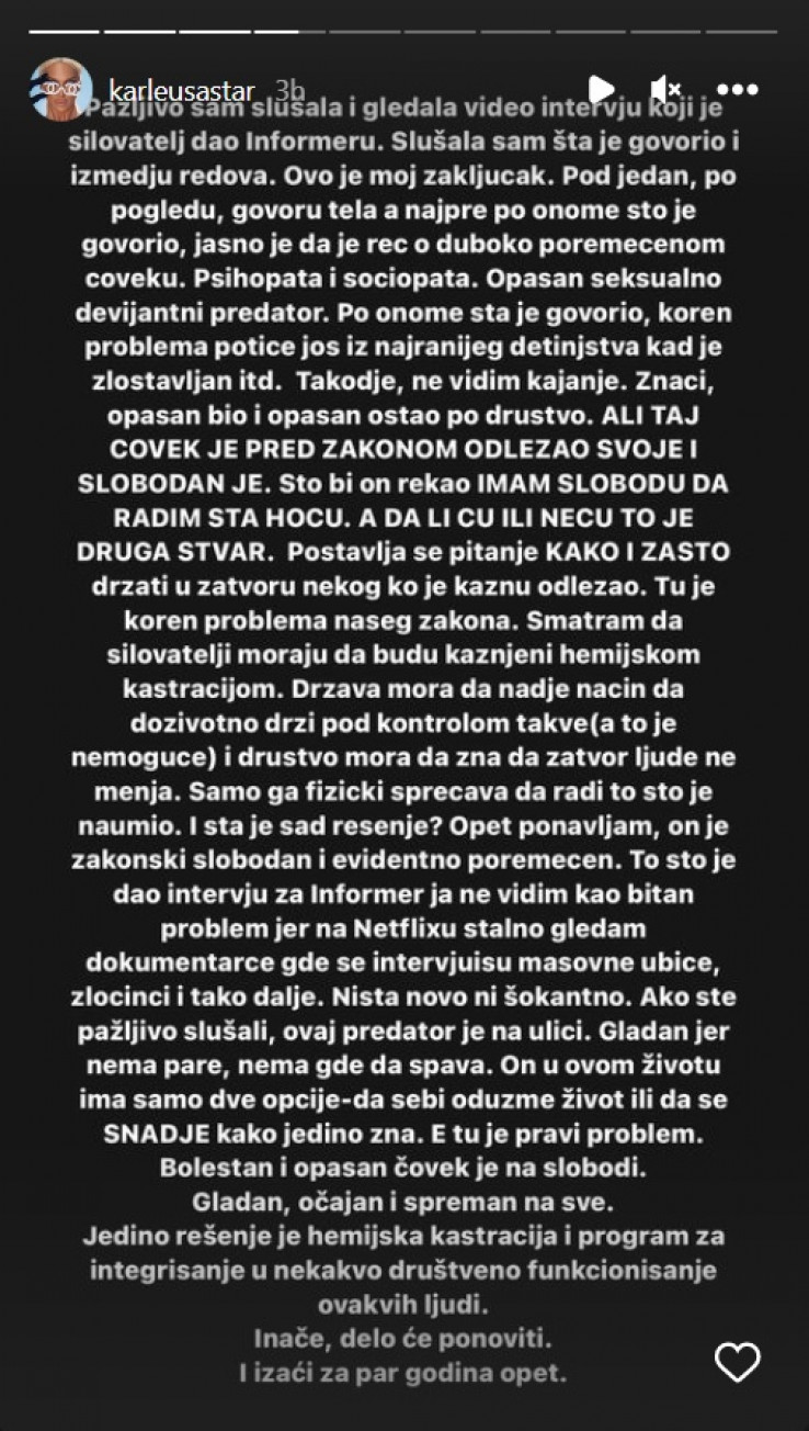 - Smatram da silovatelji moraju da budu kažnjeni hemijskom kastracijom. Država mora da nađe način da doživotno drži pod kontrolom takve, a to je nemoguće, i društvo mora da zna da zatvor ljude ne mijenja. Samo ga fizički sprječava da radi to što je naumio - napisala je Karleuša.