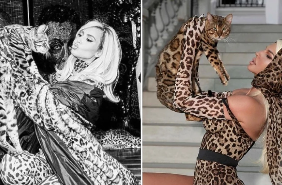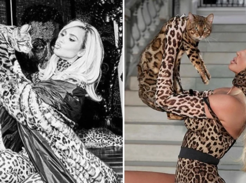 Na jednoj od fotografija u rukama drži bengalsku mačku, a slavna reality zvijezda napravila je identičnu pozu kao i srbijanska pjevačica Jelena Karleuša nekoliko mjeseci ranije.