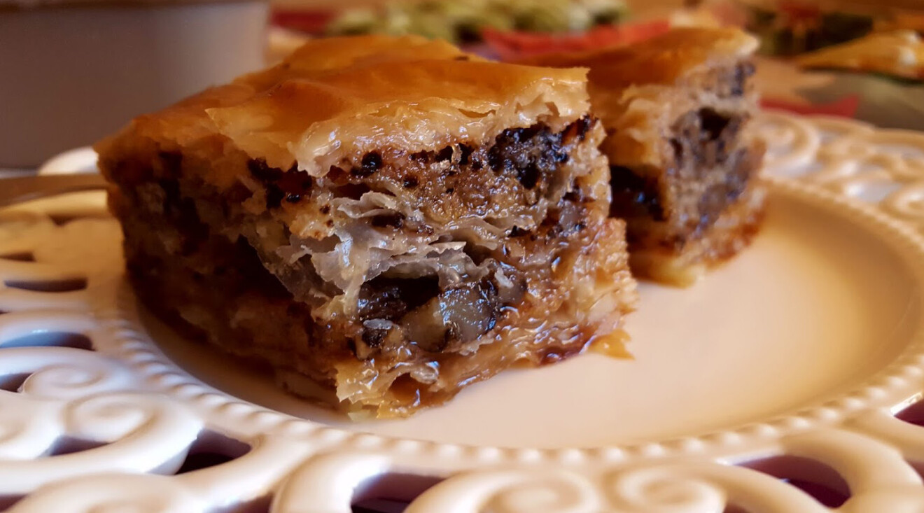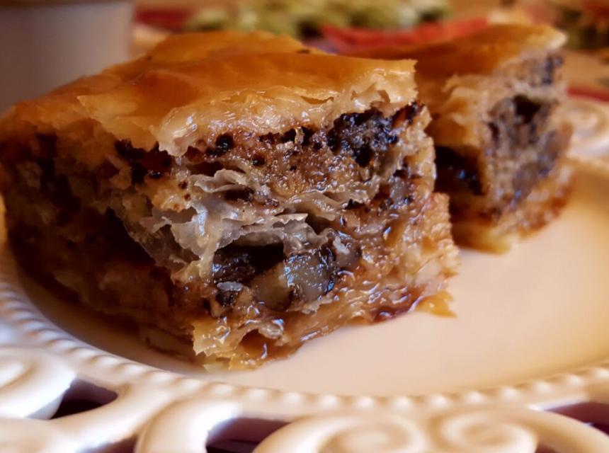 Dio pripremljene smjese stavite na četvrtu koru pa nastavite tako dok ne utrošite sav materijal. Posljednje četiri kore samo poprskajte uljem. Isijecite baklavu na rombove. Pecite baklavu sa suhim šljivama oko 40 minuta, u rerni zagrijanoj na 200 stepeni.