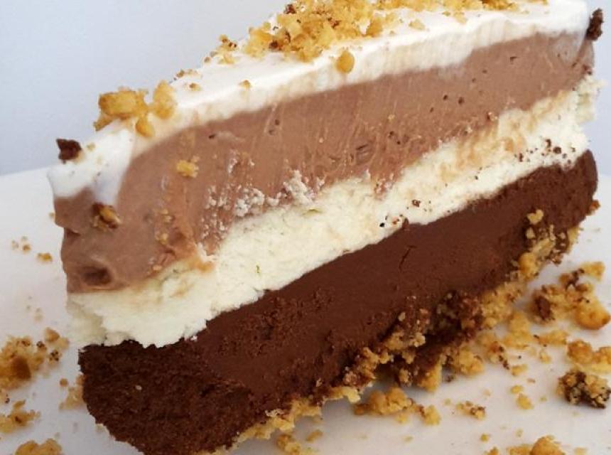 Slaganje kolača. Biskvit. Pola kreme od čokolade za kuvanje. Pola kreme sa bijelom Milka čokoladom. Pola kreme sa Milka čokoladom sa lješnjacima. Biskvit.