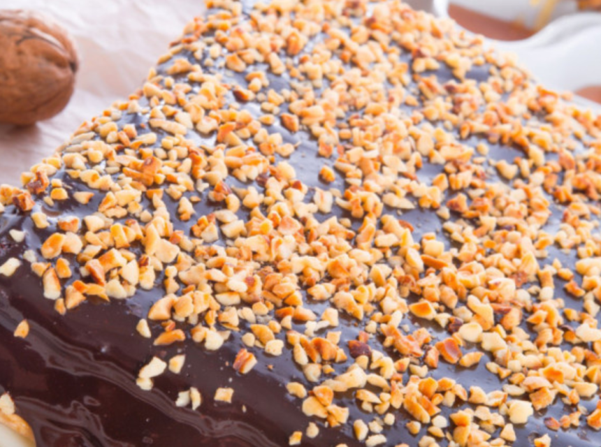 Nakon toga slijedi priprema glazure, tako da čokoladu usitnite i prelijte vrelim slatkim vrhnjem. Pustite da nekoliko minuta bude u vrelom vrhnju, a zatim dobro promiješajte dok ne dobijete glatku glazuru. Prelijte smjesu preko kolača i kada se glazura ohladi, stavite ga na hlađenje. Kad se dobro ohladi, ukrasite ga tostiranim bademima nasjeckanima na listiće (ili čokoladnim mrvicama).