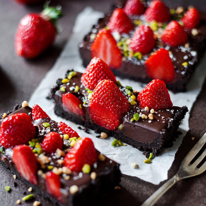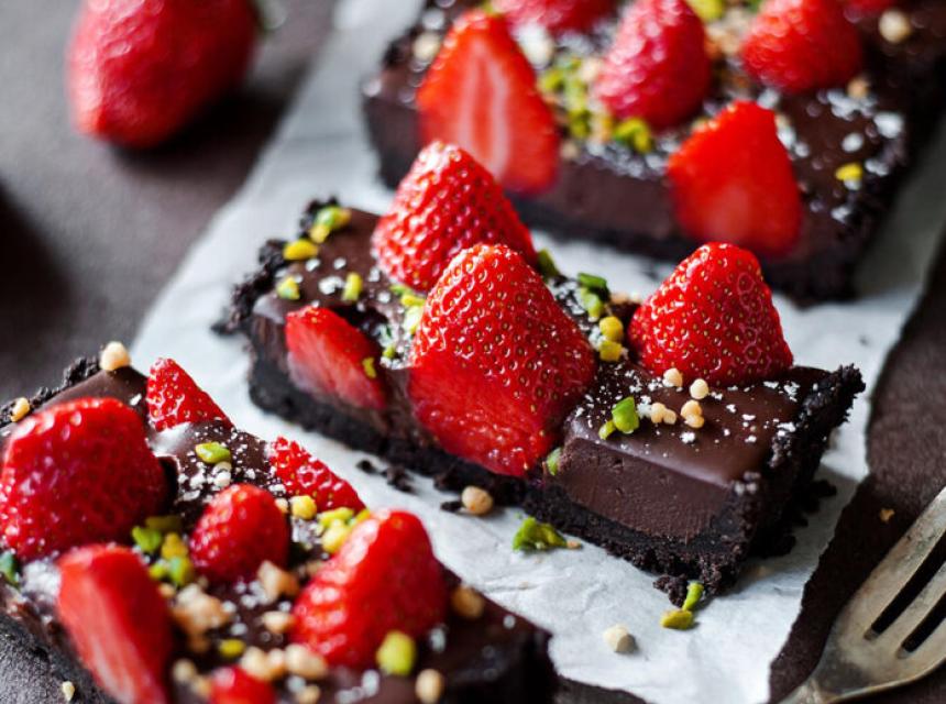 PRIPREMA: Izdrobite keks štapnim mikserom pa ga izmiješajte s istopljenim puterom. Smjesu stavite u kalup promjera 12 x 36 cm. Dok pripremate fil stavite ovo u zamrzivač. Zagrijte vrhnje na srednjoj temperaturi, sklonite s vatre pa dodajte čokoladu, miješajte dok se čokolada ne rastopi. Prespite preko tijesta i ukrasite jagodama.