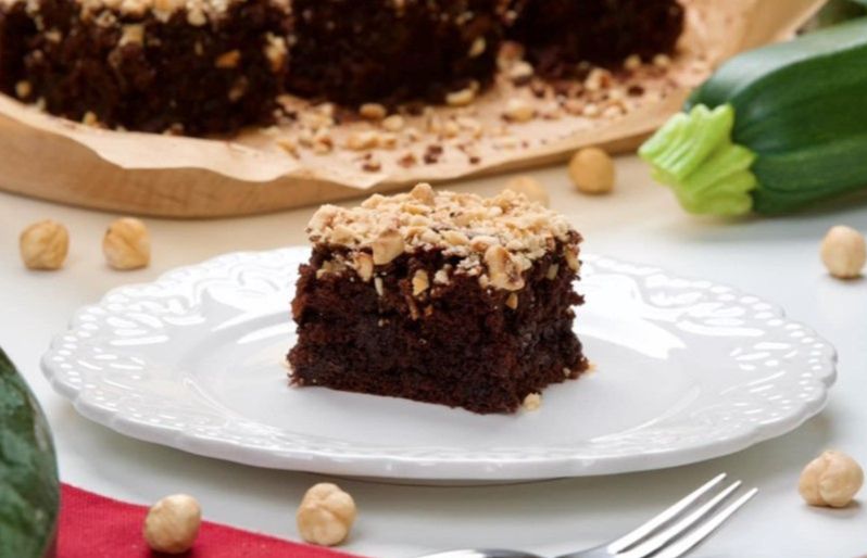 Smjesu izlijte u pleh obložen pek-papirom, pospite lješnjacima i pecite u rerni zagrijanoj na 180 stepeni 40 minuta.