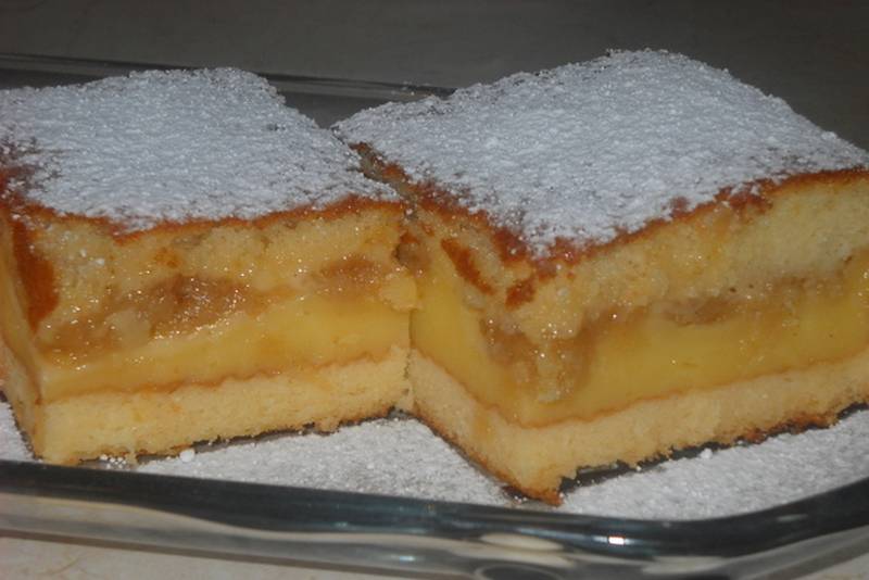 Pre posluzivanja kolac pospite prah secerom. Pecite kolac na 200 stepeni. Jabuke izrendajte dodajte secer pa ih lagano prodinstajte dok voda ne ispari. Ostavite da se ohladi. Puding skuhajte po uputstvu na kesici.