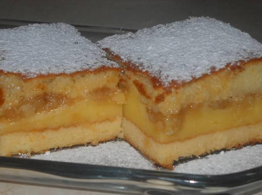 Umutite mikserom jaja,šecer i vanilin šećer dok ne postanu pjenasta pa u tankom mlazu dodajte ulje,pa mlijeko i na kraju brašno pomiješano sa praškom za pecivo. Izručite pola tijesta u podmazan pleh ( mozete i u okrugli kalup za tortu br 26 ) pa pustite neka se peče oko 10 min dok kora malo ne pozuti. Onda pleh izvadite van pa preko njega premazite puding kremu pa preko kreme fil od jabuka. Sve to prekrijte ostatkom smjese pa vratite u rernu jos 15 tak minuta da se ispece do kraja.