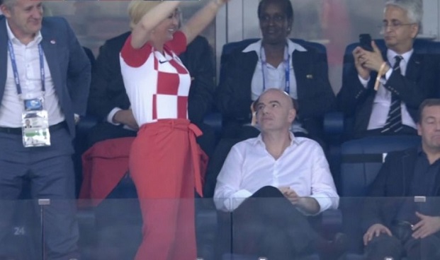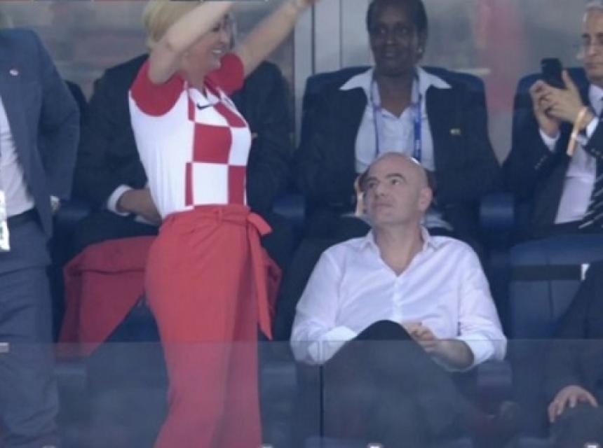 Vidjevši da Vidin udarac glavom prolazi kroz noge Vedranu Ćorluki i ulazi u mrežu ruskog vratara Igora Akinfejeva, Grabar-Kitarović se ustala iz svog mjesta pored predsjednika FIFA-e Giannija Infantina i Medvedeva te proslavila vodstvo Hrvatske.
