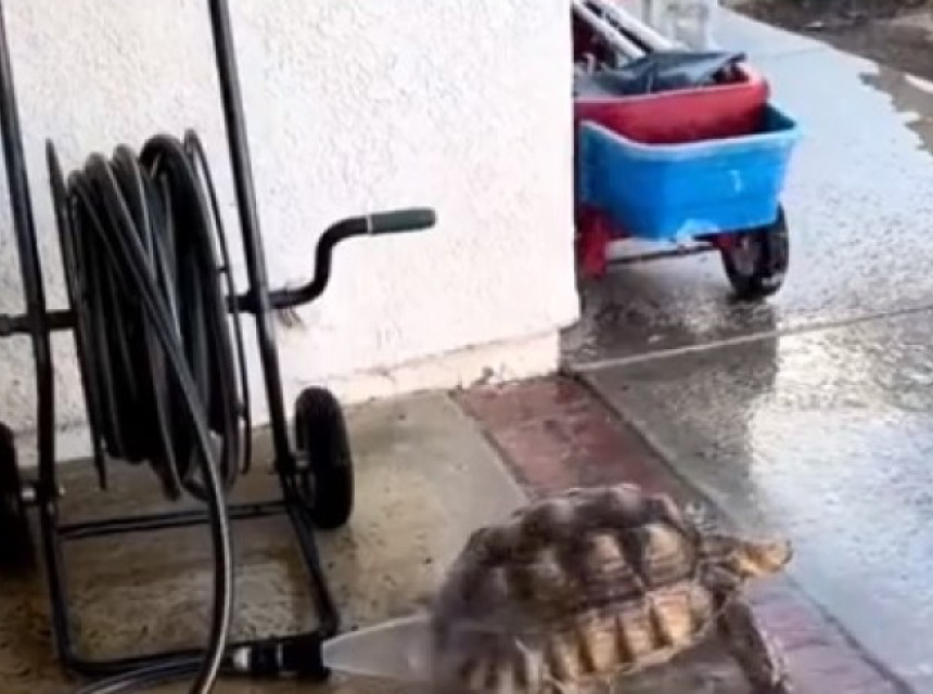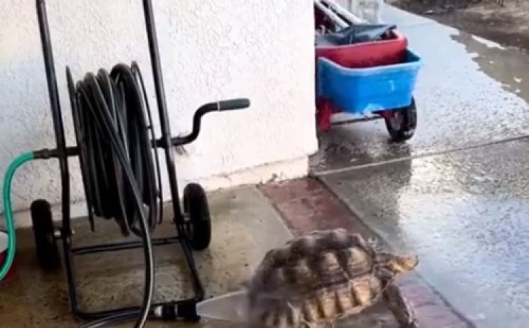 Voda iz šlaufa, kojeg su vlasnici ostavili na dvorištu, teče pod pritiskom koji kornjači očigledno jako odgovara.
