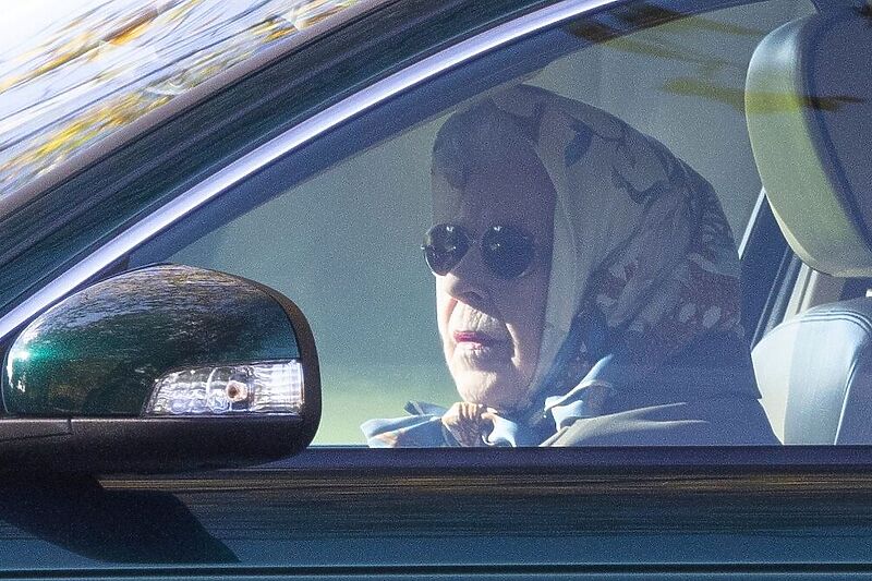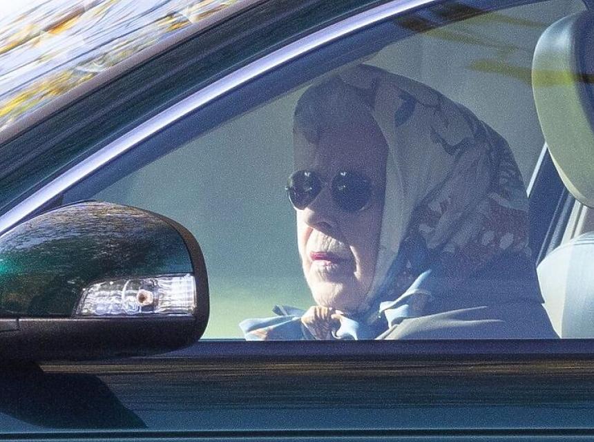 Fotografije, koje su objavili britanski mediji, pokazuju kraljicu (95) samu za volanom zelenog Jaguara sa sunčanim naočalama i maramom.