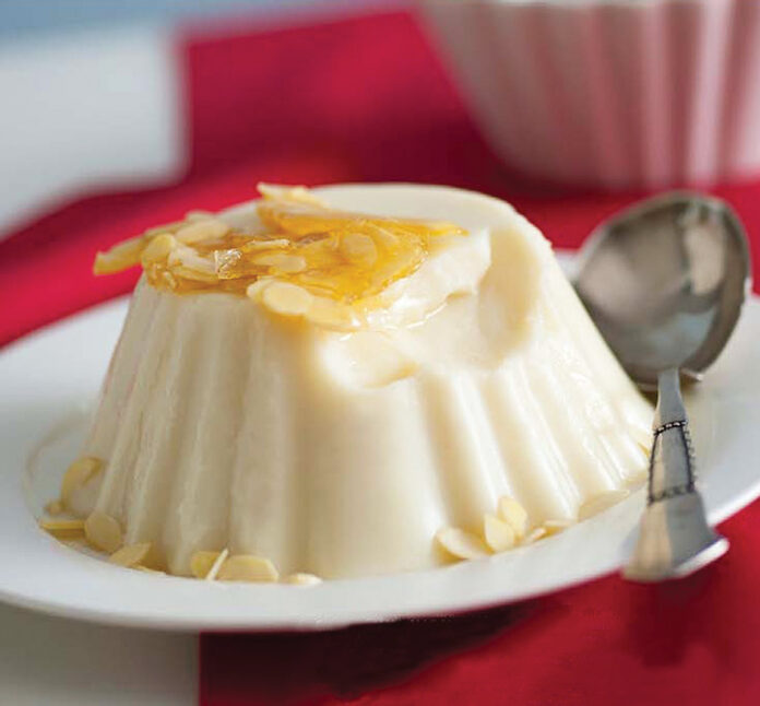 PRIPREMA: Bademe preliti vrelom vodom, ocijediti, oguliti, ubaciti u blender, dodati kašiku-dvije mlijeka, šećer u prahu i malo soli. Miksati oko 5 minuta, te procijediti kroz gazu i dobro istisnuti mlijeko. Razmutiti gustin u 1 dl mlijeka, a ostatak pomiješati s izmiksanim bademima iz gaze i prokuhati. Sjediniti obje smjese, kuhati oko 5 minuta uz neprestano miješanje dok se ne zgusne i preliti u mokru keramičku ili staklenu posudu (ili 8 manjih). Kada se krema ohladi, staviti je u frižider. Šećeru dodati 1 kašiku vode, zagrijati da se karamelizira, umiješati listiće badema, promiješati i izliti na papir za pečenje 8 hrpica. Kremu ukrasiti karameliziranim bademima i poslužiti.