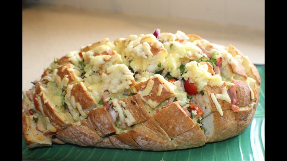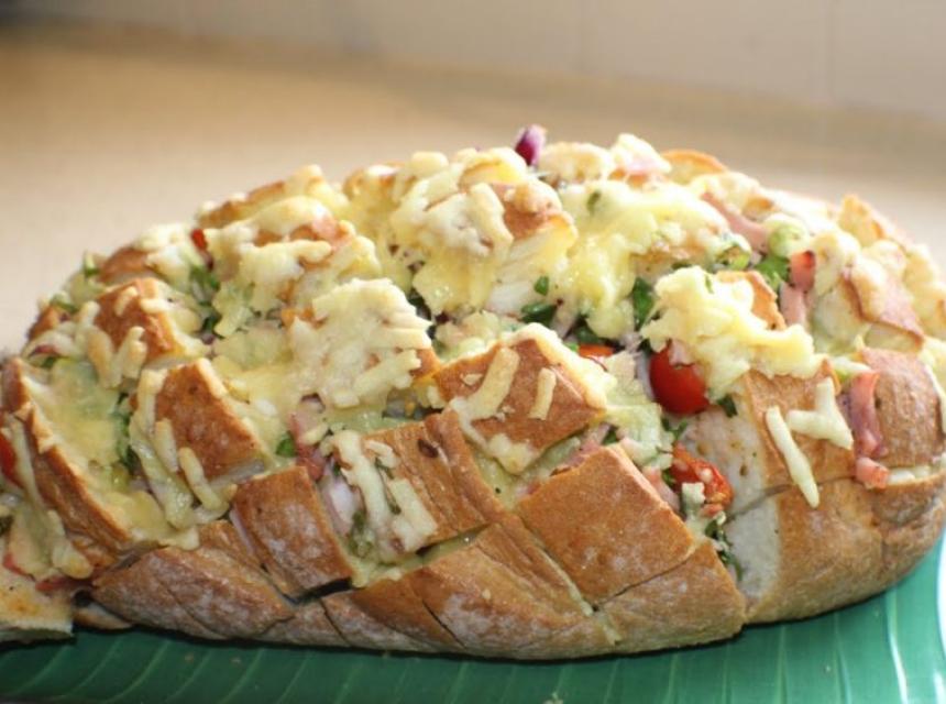 - U posudi umutite jaja, dodajte začine po želji i u sve umiješajte pureću šunku, nasjeckanu prasu, narendanu mrkvu i sir. Dobivenom smjesom napunite kruh. Sve pospite kockicama hljeba i s još malo šunke.