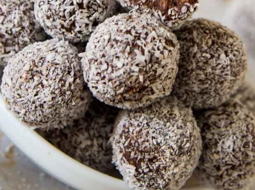 Sastojci: 250 g keksa, 400 ml (zaslađenog) kondenziranog mlijeka, 1 šolja od 250 ml kokosovog brašna, 1 kašičica esencije vanilije, 2 kašike gorkog kakaa, još kokosovog brašna za ukrašavanje.