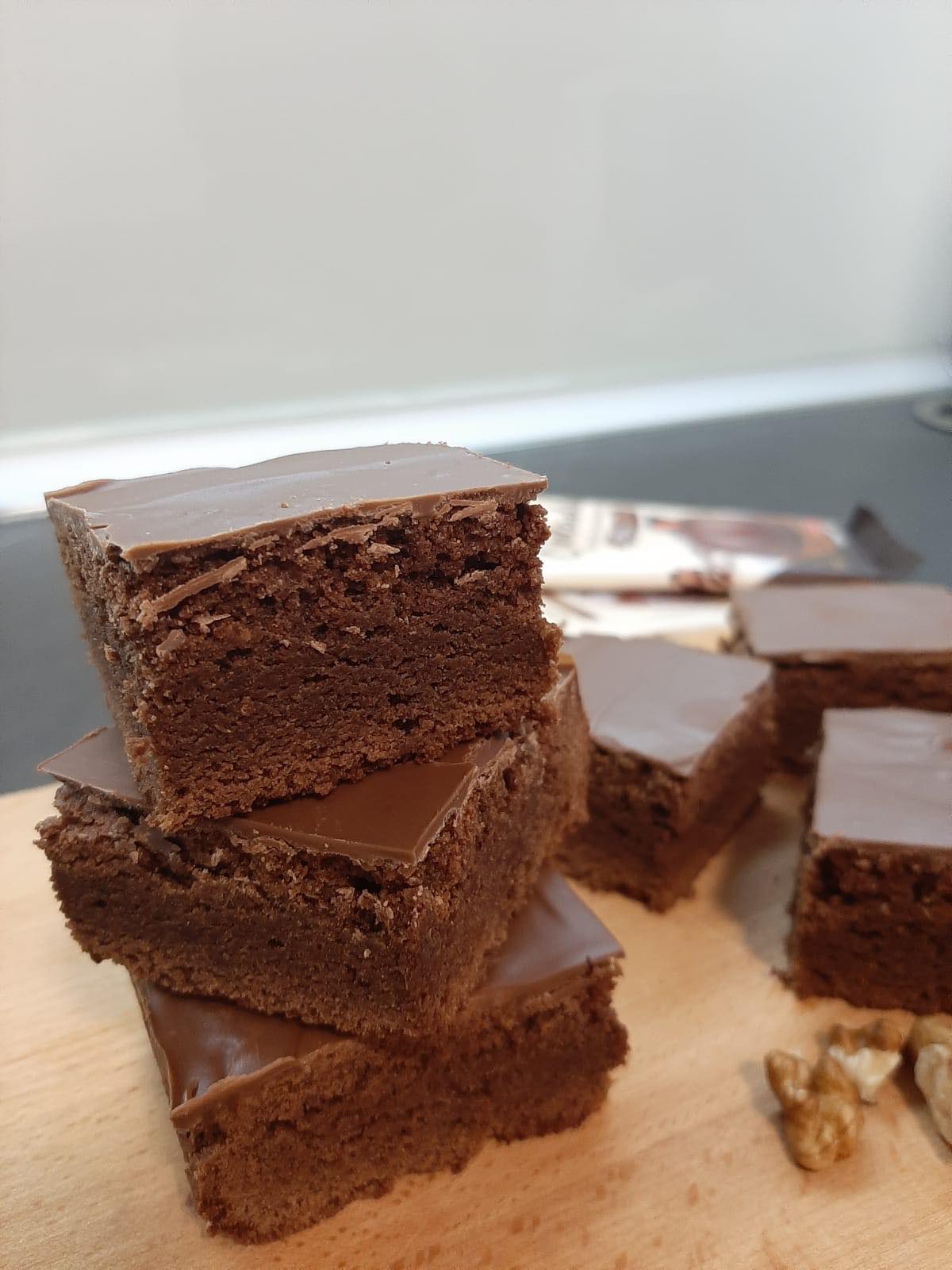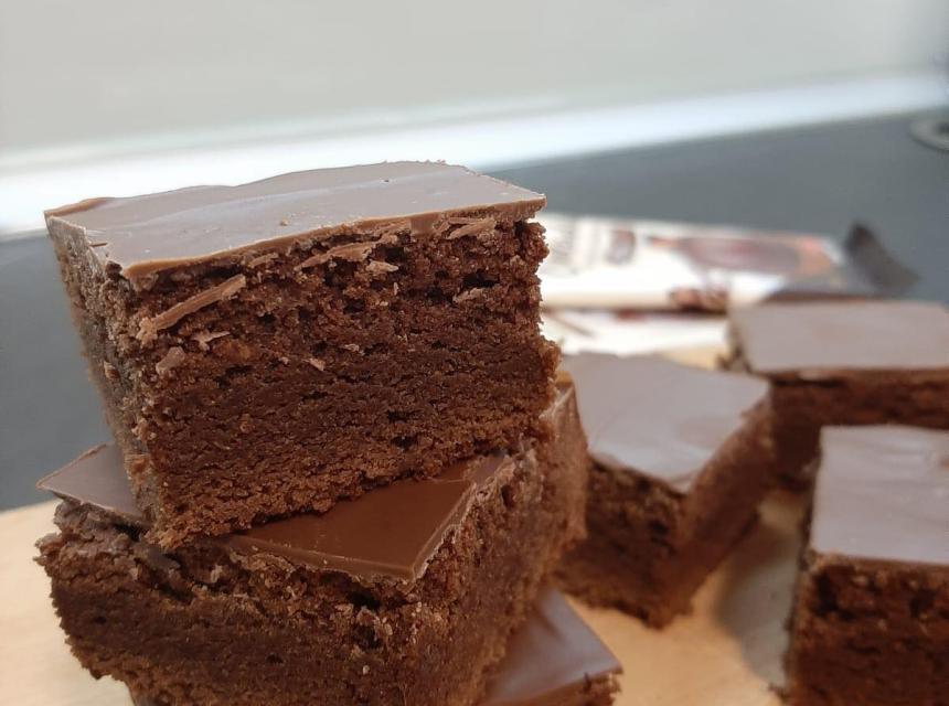 Na pari otopite 120 grama putera i 200 grama čokolade za kuhanje.U drugu posudu stavite 150 grama šećera te postepeno dodajte 3 jaja i mješajte dok se ne sjedini.Dodajte prethodno otopljenu čokoladu i puter, te stavite još prstohvat soli,1 malu kašiku ekstrakata vanilije,100 grama glatkog brašna i 3-4 kašike kakaa.Sve dobro izmješajte stavite u kalup 23x23 koji cete obložiti papirom te pecite na 180 stepeni nekih 20-25 minuta.Kad se ispeče prelijete sa još 100 grama otopljene čokolade za preljev. Uživajte😍