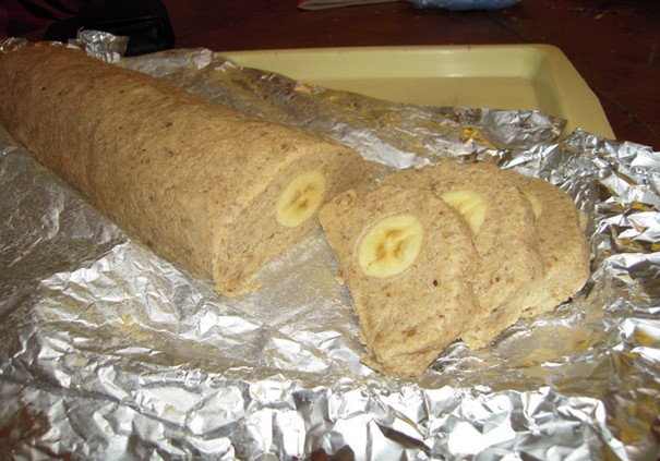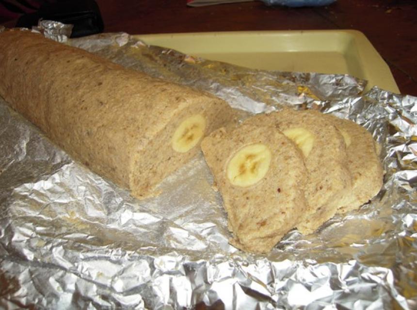 Umutiti margarin sa šećerom u prahu. U to dodati dvije propasirane banane, mljeveni keks i orahe. Sve dobro sjediniti i razviti oklagijom na aluminijumskoj foliji u obliku pravougaonika. Na sredinu staviti preostale dvie banane i uviti u rolat uz pomoć folije.