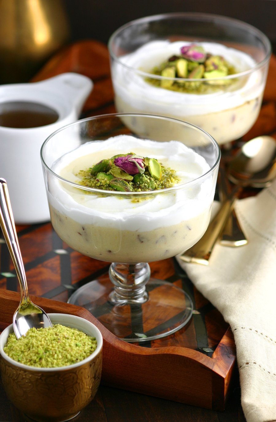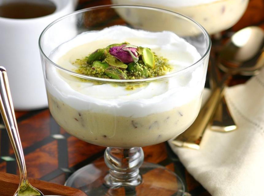 PRIPREMA: Zagrijte mlijeko i šećer, miješajte dok se šećer ne rastopi. Pustite da zavri, zatim umiješajte brašno. Smanjite jačinu vatre i ostavite da lagano kuha, uz povremeno miješanje. Kad se počne zgušnjavati maknite s peći i izlijte u pripremljene posudice. Ostavite da se ohladi i pripremite kremasti dio. Pomiješajte rižino brašno s malo mlijeka, a ostatak mlijeka zagrijte sa slatkim vrhnjem. Toj mješavini mlijeka i vrhnja dodajte šećer i miješajte dok skoro ne provri. Kašiku te vrele mješavine ulijte u rižino brašno i zatim brašno izlijte u posudu s mlijekom i vrhnjem. Dodajte prezlu i ružinu vodicu, miješajte dok se ne zgusne. Ostavite da se malo ohladi pa prelijte po kremi u posudicama i ohladite.