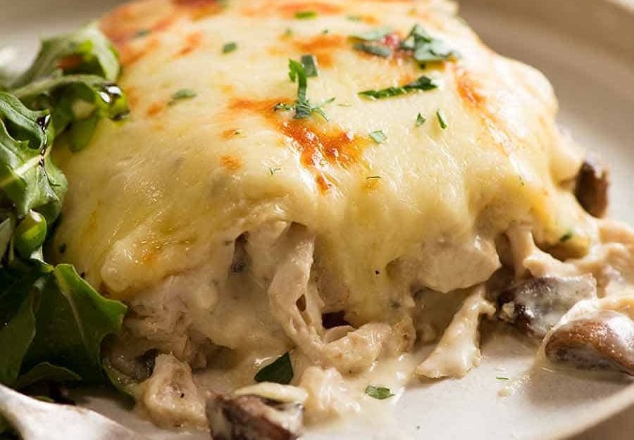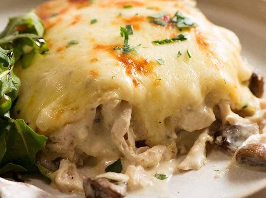Sastojci za lazanju sa piletinom: 400 g bijelog mesa, 1 pakovanje kora za lazanje, 200 ml pavlake za kuhanje, pola čaše kisele pavlake, 200 g sira, so, biber, suhi začini, 120 ml kečapa.