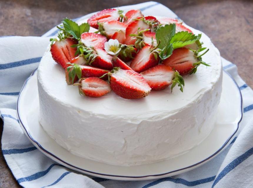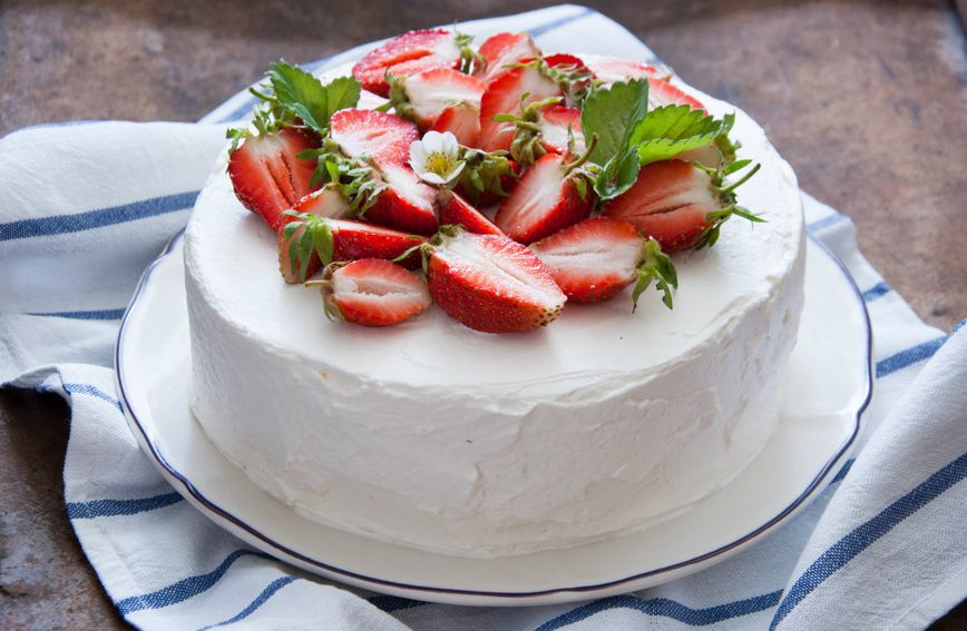 4. Ako ste radili jednu veliku koru, prerežite je po dužini na tri jednaka dijela pa složite kolač: na prvu koru nanesite dio kreme od vanilije, po kremi složite narezano voće pa premažite tučenim slatkim vrhnjem. Ponovite isto i s ostale dvije kore pa cijeli kolač premažite preostalim tučenim vrhnjem i ukrasite po vlastitom ukusu. Ako ste radili više okruglih kora, slažite ih jednu na drugu i filajte na isti način pa naposljetku premažite tučenim slatkim vrhnjem i ukrasite voće.