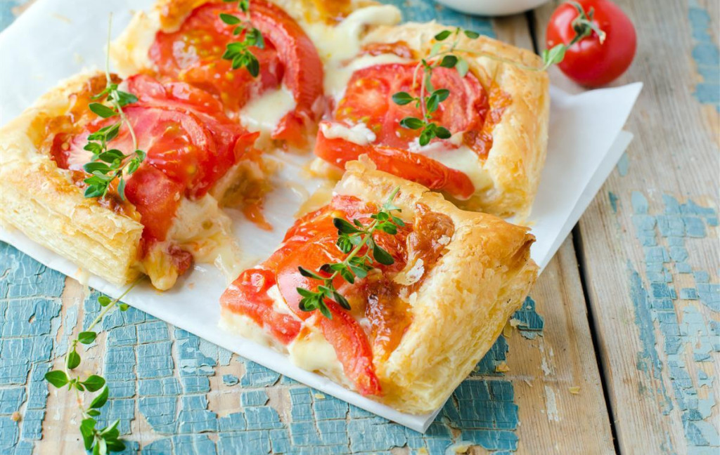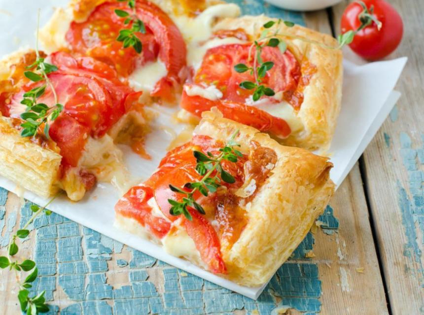Zagrijte pećnicu na 180 stepeni. Dok se pećnica grije, razvaljajte lisnato tijesto i narežite krajeve. Sredinu premažite pestom, pa na njega posložite paradajz izrezan na tanke kriške, posolite ih, a na njih mozzarellu izrezanu na kriške koju također možete posoliti i pobiberiti. Presavijte narezane trakice preko mozzarelle, pa tijesto premažite razmućenim žumanjkom i pospite pinjolima. Pecite 20-25 minuta dok ne porumeni. Ukrasite svježim bosiljkom.