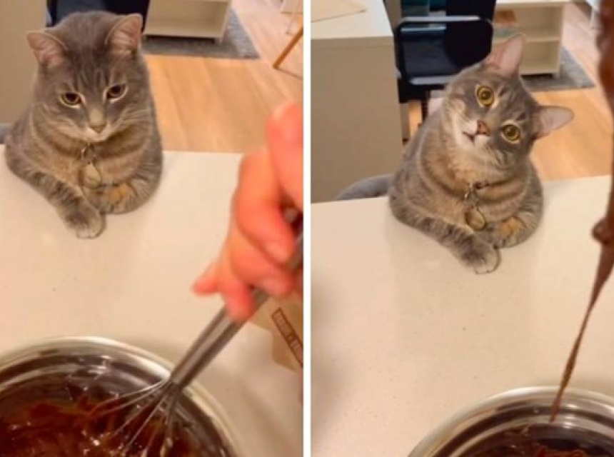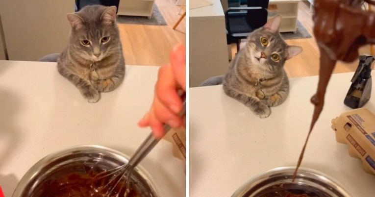 Snimka prikazuje korisnicu kako mijesi čokoladu za kolač, dok je njezin mačak Za'atar zapanjeno gleda. "Moj sous chef", napisala je korisnica u opisu objave.