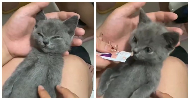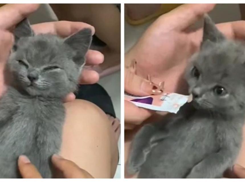Mače mirno drijema dok ga vlasnik mazi po glavi i trbuhu i čini se kao da bi svakog časa moglo zaspati. U jednom trenutku žena mu pred njuškicu stavlja slatkiš. Mala mačka se u sekundi razbudi i krene grickati ambalažu, a njen pogled kad je shvatila o čemu se radi je stvarno urnebesan.
