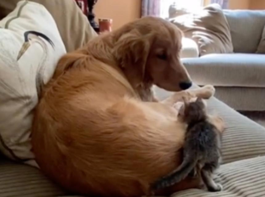Kai se probudio i pogledao što mačić radi pa ga pustio da se sklupča među njegove šape.