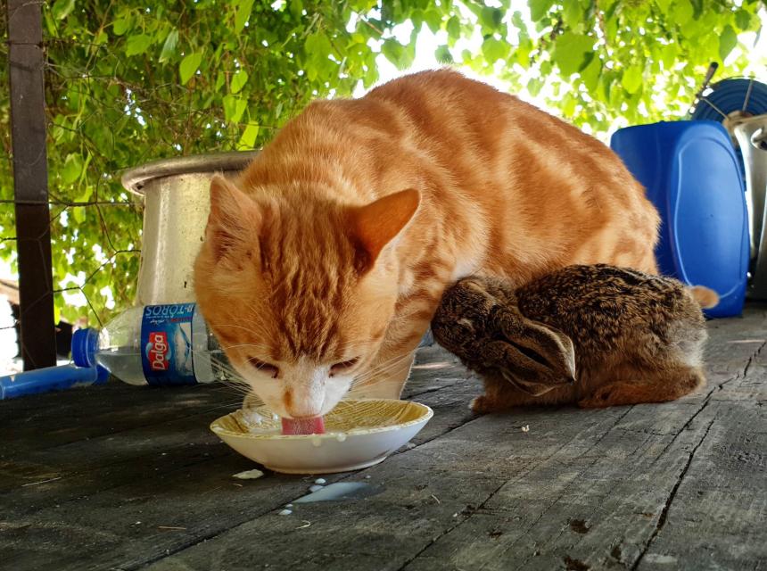 Mladunče zeca pronašao je 18-godišnji Enes Karaoglu iz sela Yesilyayla, koji ga je donio kući. Ova mačka i njeni mačići prihvatili su brigu o novom članu porodice.