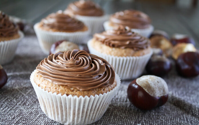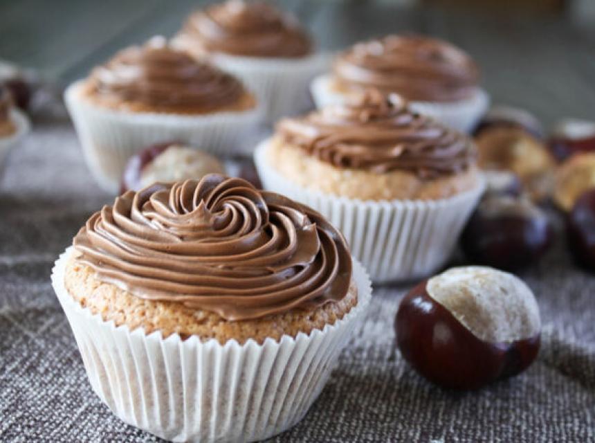 PRIPREMA: Dobro umutite jaja sa šećerom. Postepeno dodajte kesten-pire, miješajući kutljačom, pa onda mljeveni badem i prašak za pecivo. U pleh za mafine (12 komada) stavite papirne korpice. Sipajte smjesu u svaku korpicu, pa pecite u prethodno zagrijanoj rerni na 170°C 25 minuta. Za ukrašavanje zagrijte vrhnje za šlag, dodajte čokoladu izlomljenu na sitnije komade i miješajte dok se čokolada ne istopi, a smjesa postane glatka. Ohladite, pa ili premažite mafine ili umutite i ukrasite po želji.