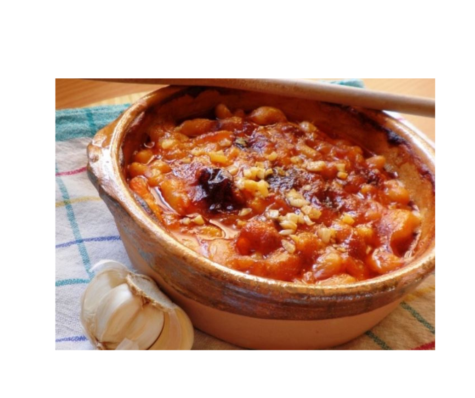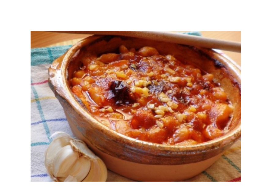 Na kraju zapržite s mljevenom crvenom paprikom i brašnom, a zatim zalijte s još 300 ml vode od rebara i prokuhajte. Stavite kuhani grah u zemljanu posudu, dodajte kuhana rebra, pirjano povrće, začine i pažljivo promiješajte. Po potrebi nalijte još vode od rebara ili običnu toplu vodu i gravče na tavče je gotovo!