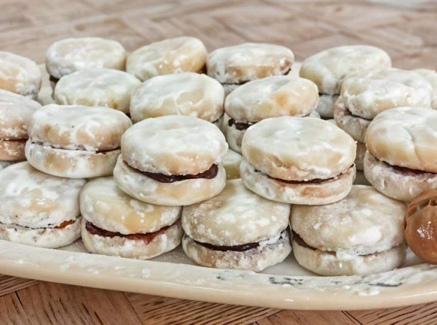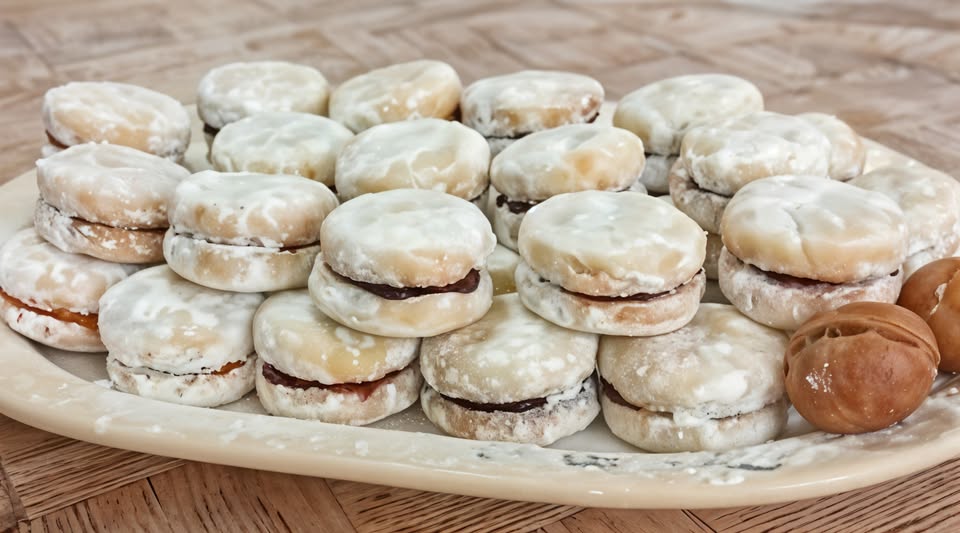 Redajte ih u pleh i pecite u rerni prethodno ugrijanoj na 200 stepeni (neka ostanu blijedožute). Kad su pečene, po dvije spojite marmeladom i uvaljajte ih u šećer u prahu.