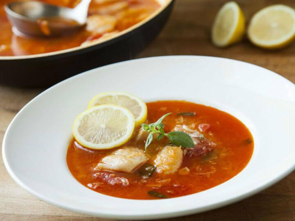 Luk nasjeckamo, bijeli luk narežemo na listiće, a filete ribe na manje komade. U tavu iznad vatre, na 2-3 kašike ugrijanog maslinovog ulja, dodamo sjeckani luk i listiće bijelog luka, posolimo, promiješamo i pržimo na laganoj vatri. Nakon 2-3 minute umiješamo koncentrat paradajza, dodamo pelati paradajz i malo ih usitnimo kuhačom, ulijemo bijelo vino i pričekamo da napola ispari. Zatim dodamo rižu, ulijemo 700 ml vode i kada provri, kuhamo 15-ak minuta na laganoj vatri. Potom dodamo komade ribe i listiće origana te kuhamo dalje. Za to vrijeme limun narežemo na kriške. Nakon 10 minuta kuhanja, juhu rasporedimo u tanjire, dodamo po krišku limuna i poslužimo. Savjet: Pelati su važan sastojak ove zdrave juhe.