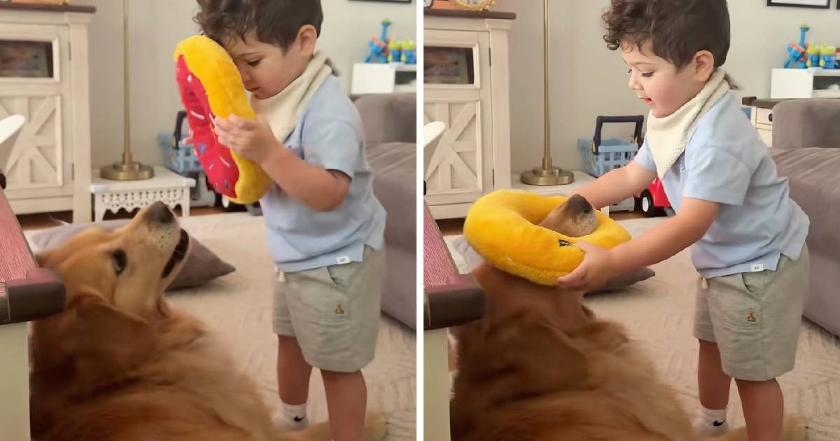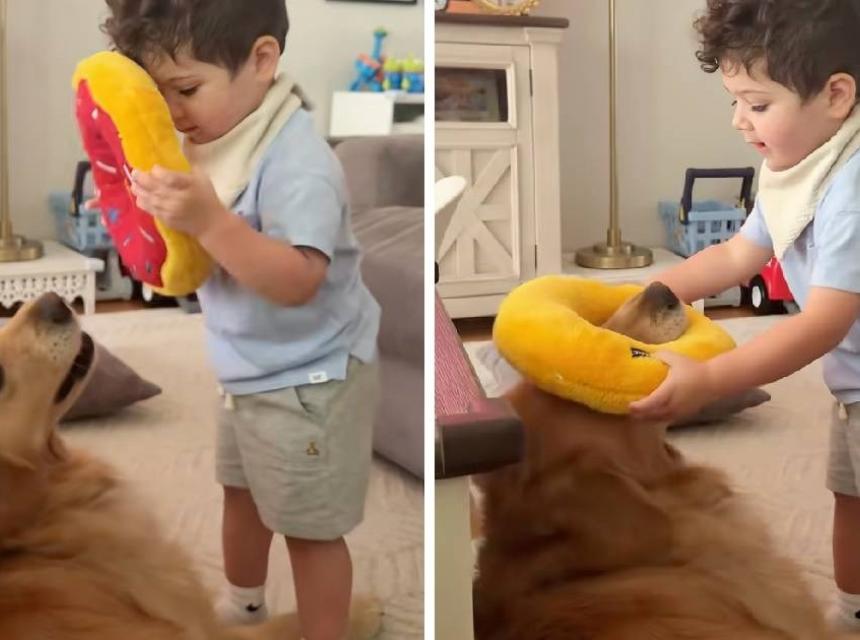 U nedavnom videu koji je brzo postigao veliku popularnost i prikupio više od 60.000 lajkova, mali Frankie prilazi psu koji leži na podu i stavlja mu plišanu igračku u obliku krafne preko njuške. "Zašto mu stalno stavlja tu igračku na glavu?" pitala se Erica u opisu videa.